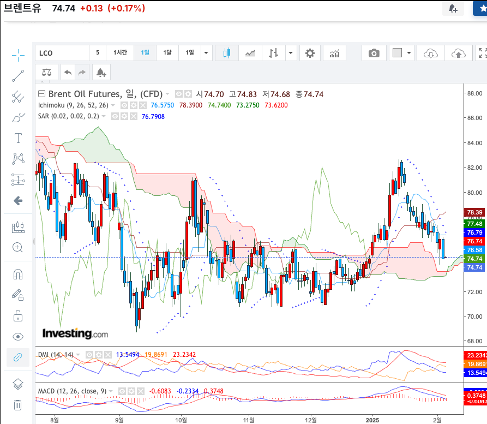 - 현재 브렌트유는 단기 조정 국면에서 $74.61 지지선 유지 여부가 중요.
